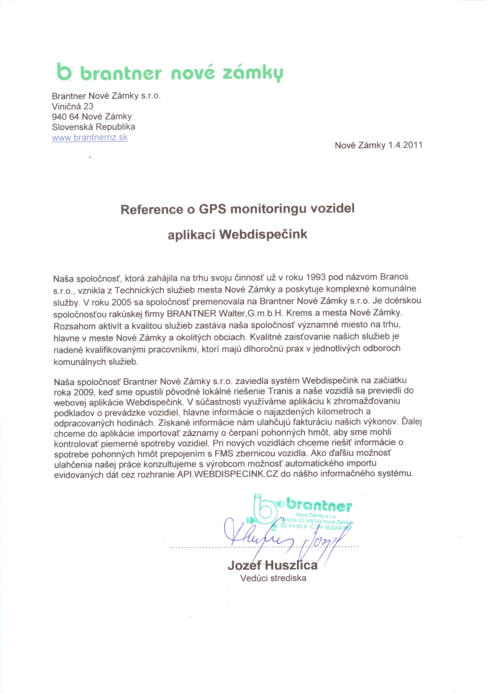 Naša spoločnosť Brantner Nové Zámky s.r.o. zaviedla systém Webdispečink na začiatku roka 2009, keď sme opustili pôvodné lokálné riešenie Tranis a naše vozidlá sa previedli do webovej aplikácie Webdispečink. V súčastnosti využíváme aplikáciu k zhromažďovaniu podkladov o prevádzke vozidiel, hlavne informácie o najazdených kilometroch a odpracovaných hodinách. Získané informácie nám ulahčujú fakturáciu našich výkonov. Ďalej chceme do aplikácie importovať záznamy o čerpaní pohonných hmôt, aby sme mohli kontrolovať priemerné spotreby vozidiel. Pri nových vozidlách chceme riešiť informácie o spotrebe pohonných hmôt prepojením s FMS zbernicou vozidla. Ako ďaľšiu možnosť ulahčenia našej práce konzultujeme s výrobcom možnosť automatického importu evidovaných dát cez rozhranie API.WEBDISPECINK.CZ do nášho informačného systému.