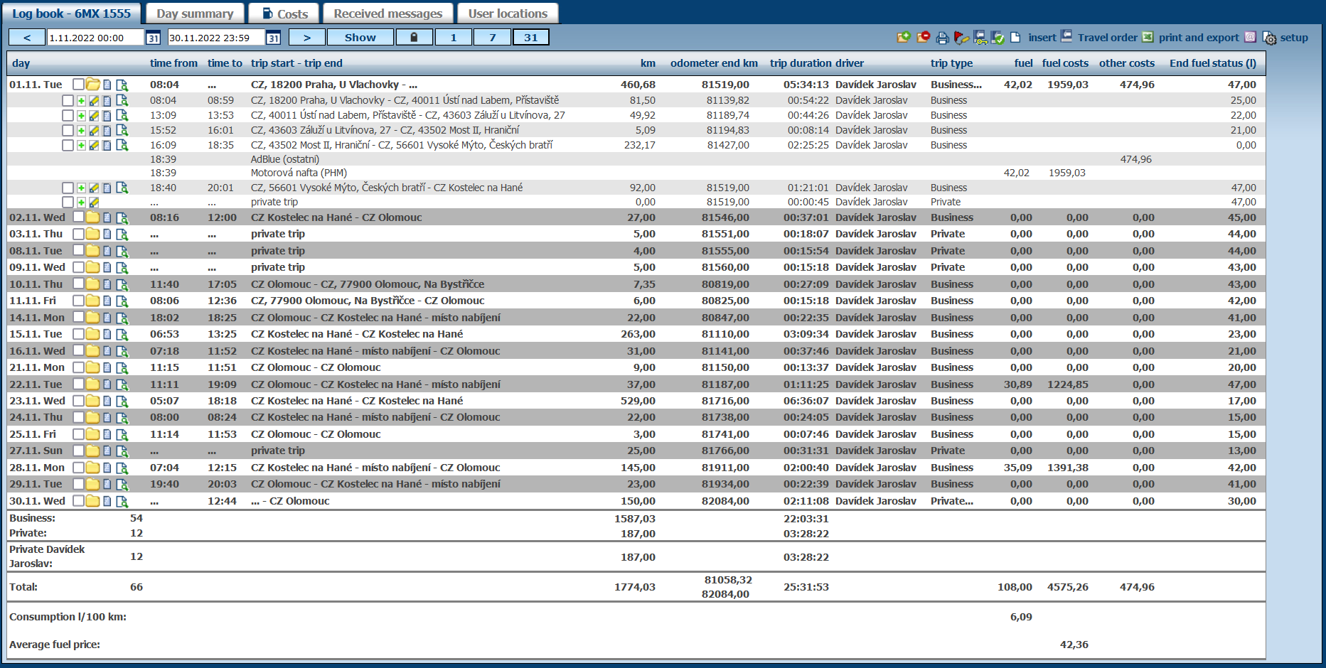 Monitoring of passenger vehicles is one of the most common telematics services. It mostly covers an automatic creation of a logbook that serves as a proof of the vehicle's cost. The drivers do not have to write a "paper" logbook and the company has a digital document for possible inspections.