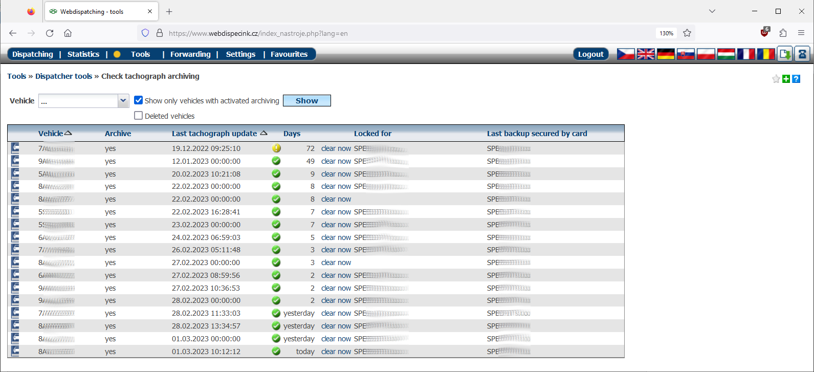 We have developed a feature that allows the digital tachograph and driver card data to be backed up remotely in a fully automated manner. This makes it easy to meet the legal obligation to read data every 90 days and 28 days for driver cards without having to physically visit the vehicle and read the data in person. The data will be available at any time in the Webdispečink app and so you can just check compliance with EU regulations 561/2006, AETR, 478/2000. Simply order the service including the company card reader and ensure that the GPS unit is correctly installed in the vehicle.