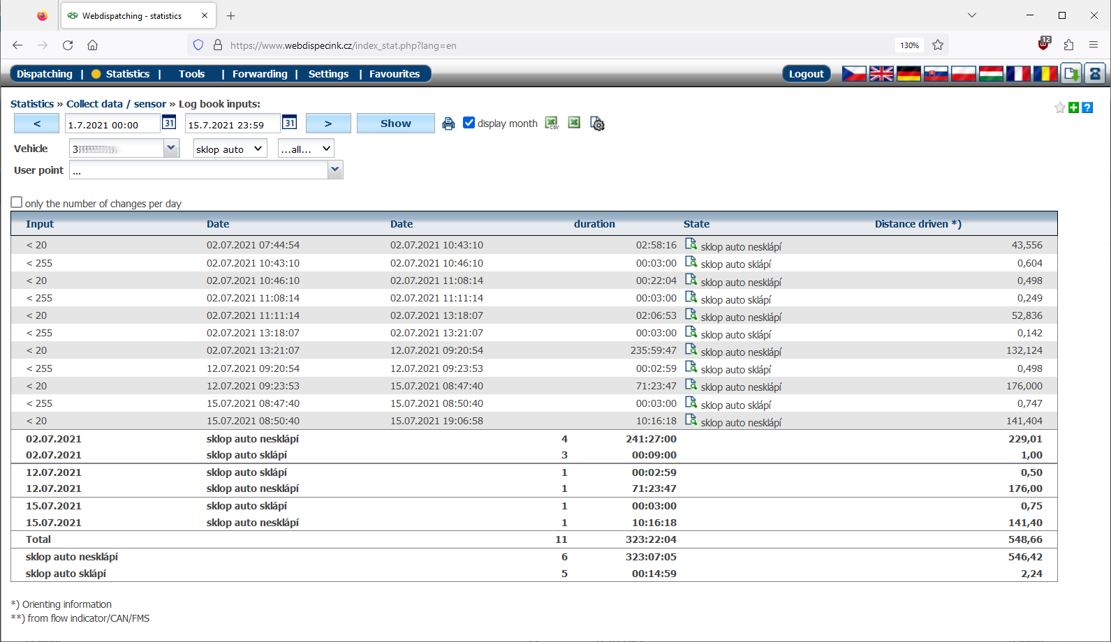 Both the WEBDISPEČINK hardware and software are designed to monitor (and of course record) important parameters related to the vehicle and its movement in real time.