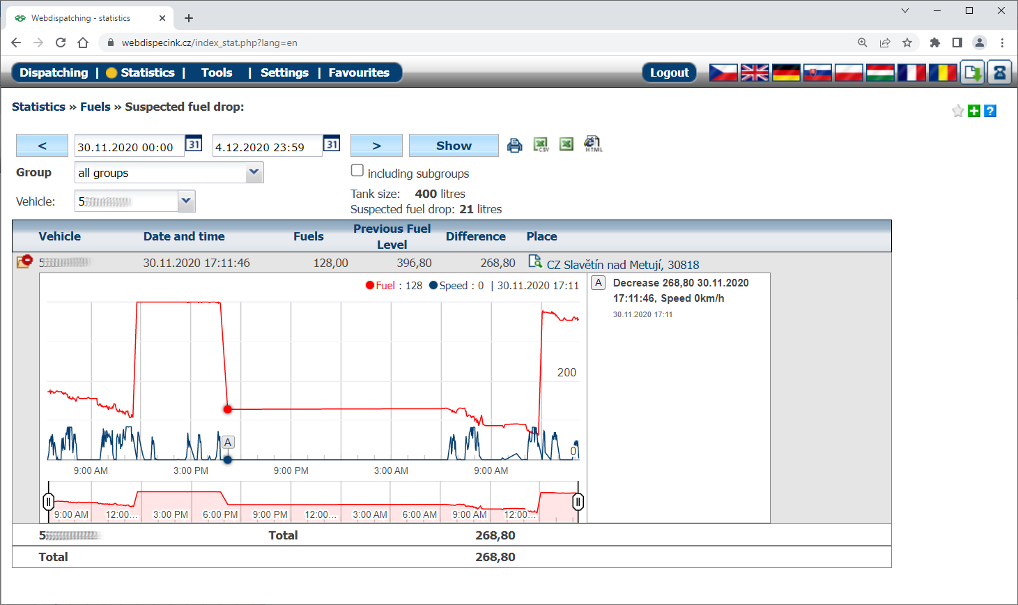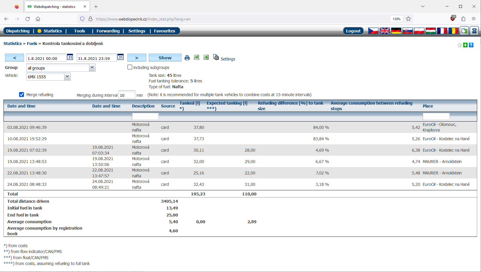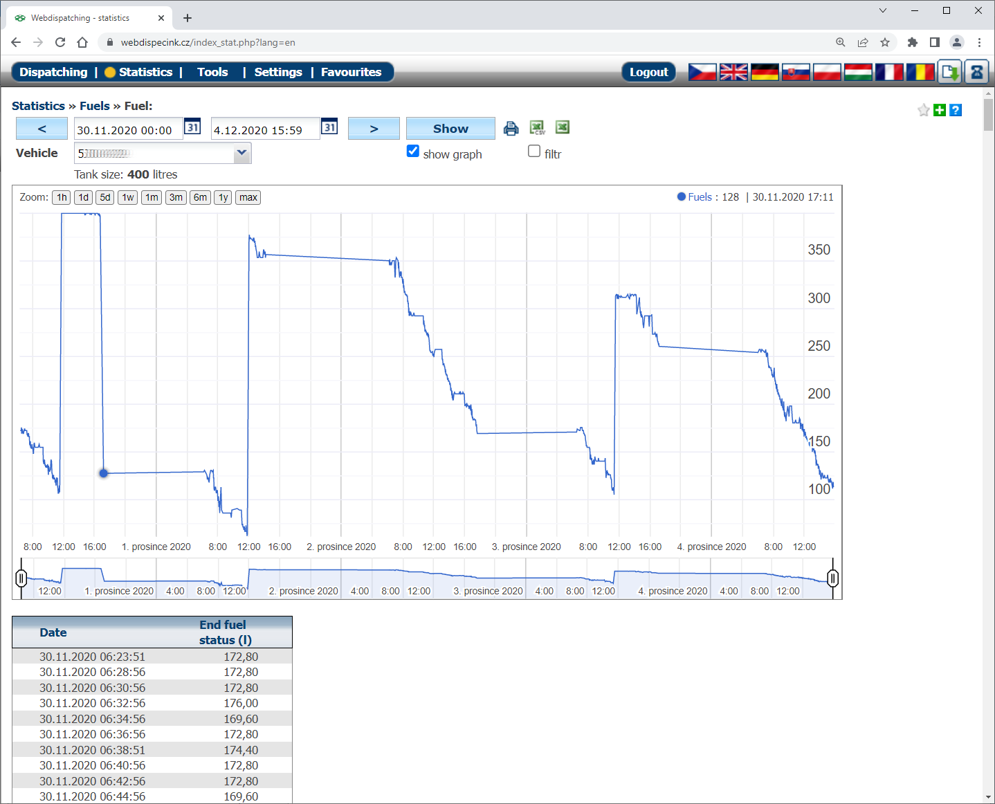 The WEBDISPEČINK application allows you to monitor data on fuel consumption and the fuel level in the vehicle's tank. This data can then be compared with the set tolerance consumption or refueling records.