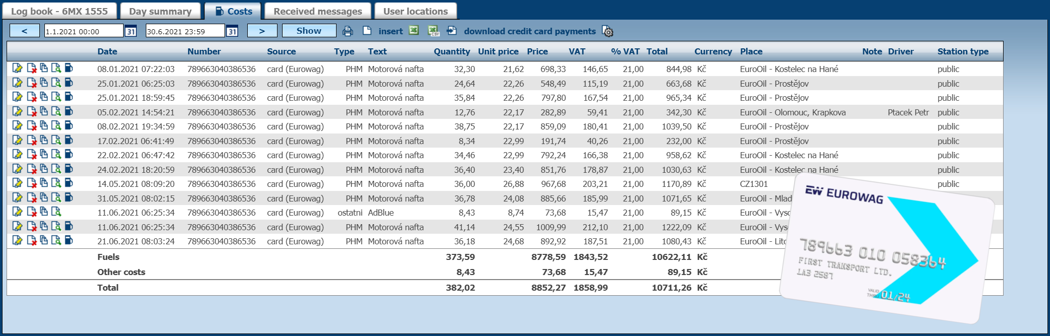 Refueling records from EUROWAG cards are automatically displayed in the WEBDISPEČINK system.