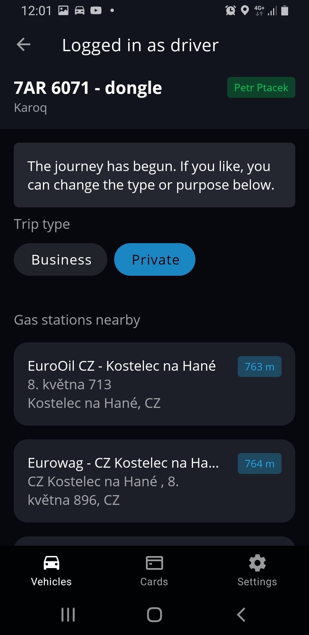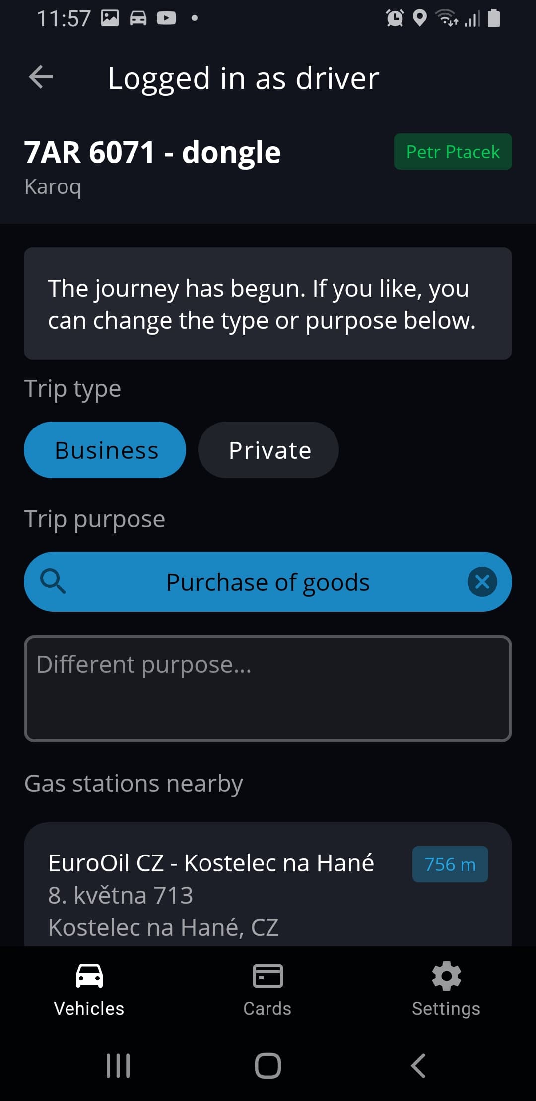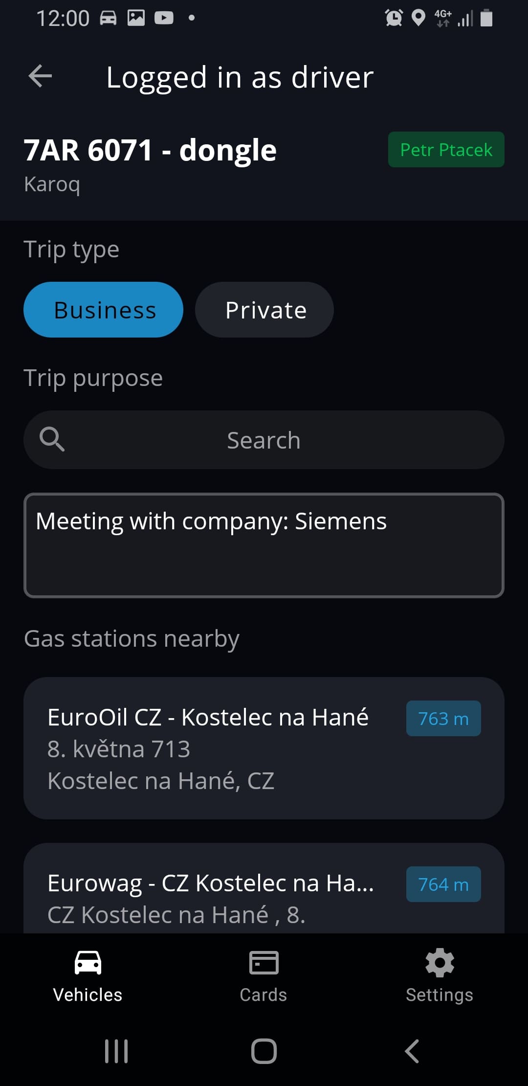 Oprócz tego aplikacja umożliwia wybór rodzaju podróży (prywatna/służbowa) oraz uzupełnienie celu podróży (z prekonfigurowanej listy lub poprzez wprowadzenie innego celu przez kierowcę).