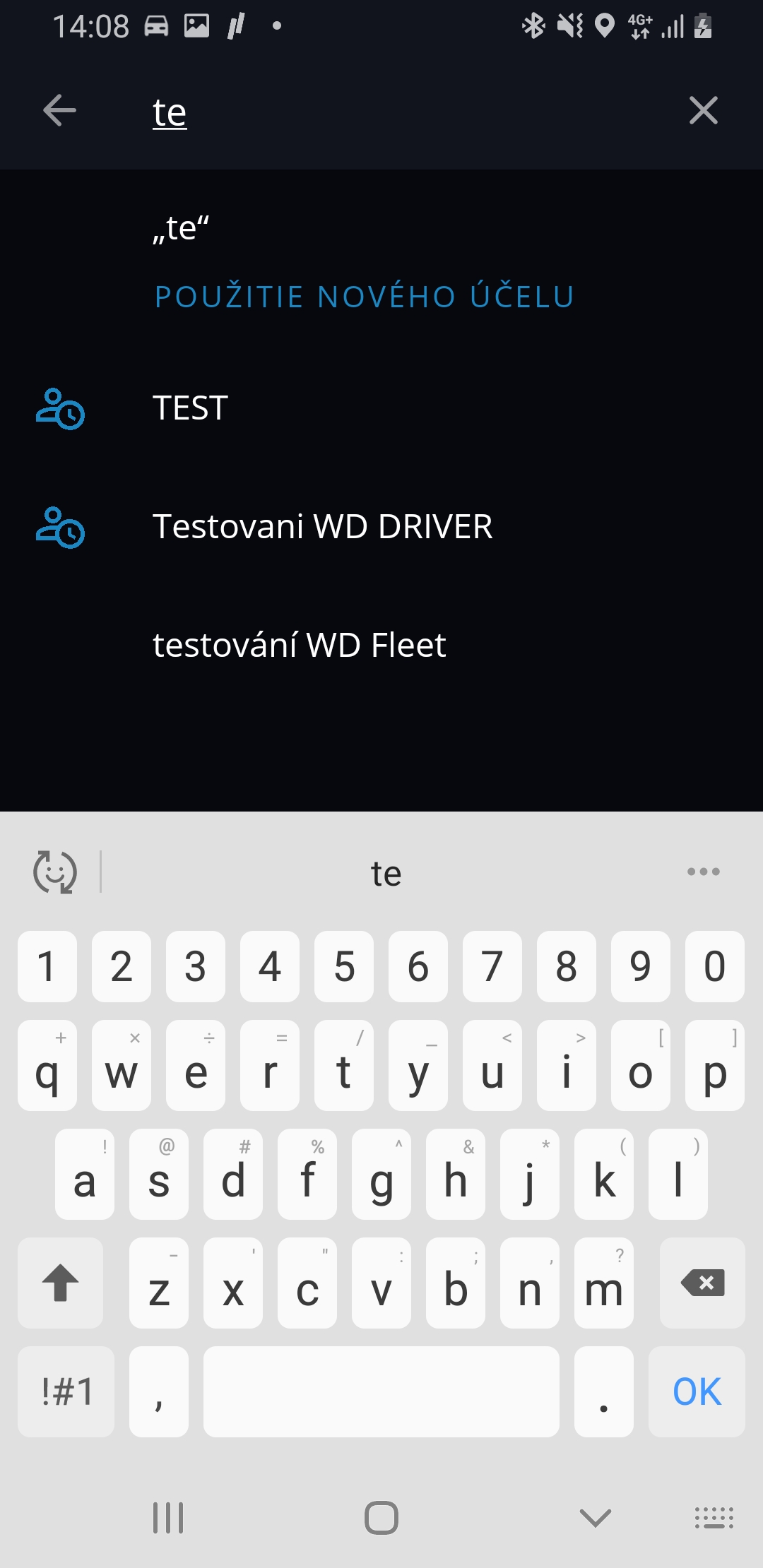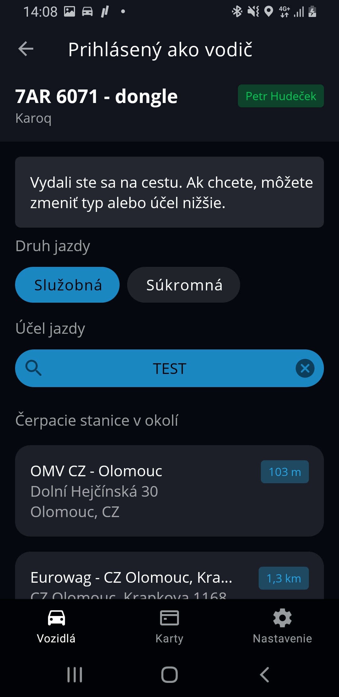 Aplikácia navyše umožňuje zvoliť typ jazdy (súkromná/služobná) a vyplniť účel jazdy (z predvoleného zoznamu alebo zapísaním iného účelu vodičom).
