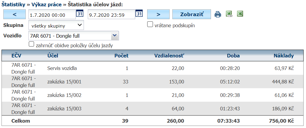 Na základe toho je v aplikácii Webdispečink možné jednoducho zistiť za akým účelom sú vozidlá používané najčastejšie a vyčísliť náklady na palivo.