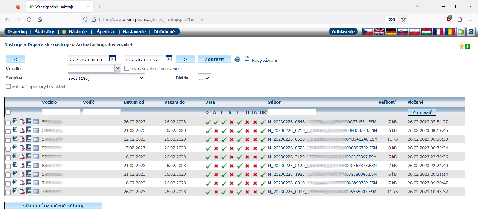 Takto vyzerajú súbory vyčítané z digitálneho tachografu s príponou ESM (kompatibilný s DDD formátom súborov)