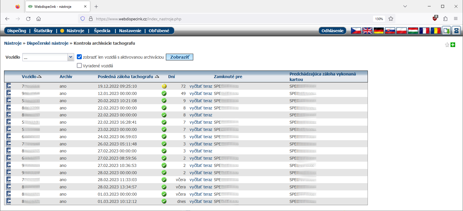 Vyvinuli sme funkciu, vďaka ktorej sa vzdialene a úplne automaticky zálohujú dáta digitálneho tachografu a kariet vodičov. Možno tak jednoducho naplniť zákonnú povinnosť vyčítania dát každých 90 a pri kartách vodičov 28 dní bez toho, aby ste museli fyzicky navštíviť vozidlo a vyčítať dáta osobne. Dáta totiž budete mať kedykoľvek k dispozícii v aplikácii Webdispečink a následne len skontrolujete dodržiavanie nariadenia EU 561/2006, AETR, 478/2000. Stačí si službu objednať vrátane čítačky karty podniku a zaistiť správnu montáž GPS jednotky vo vozidle.