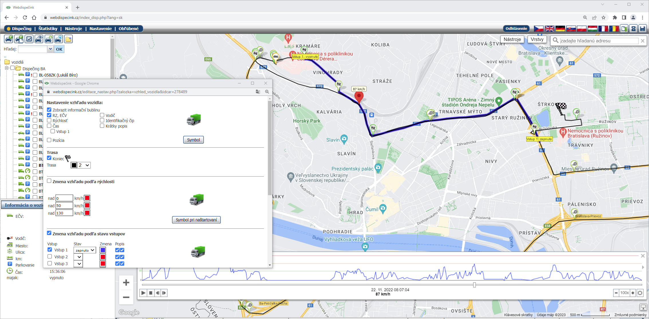 - Prehľad o aktuálnych pozíciách vozidiel a v nich čipom identifikovaných vodičoch.